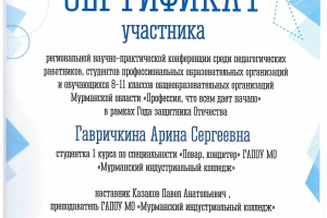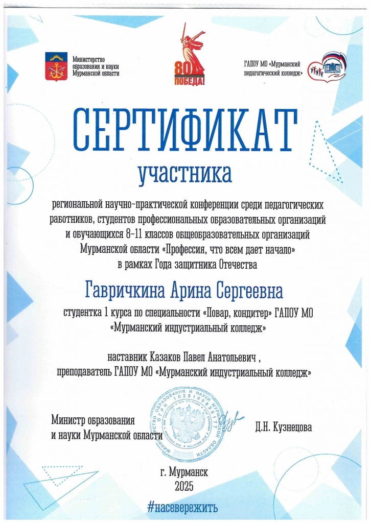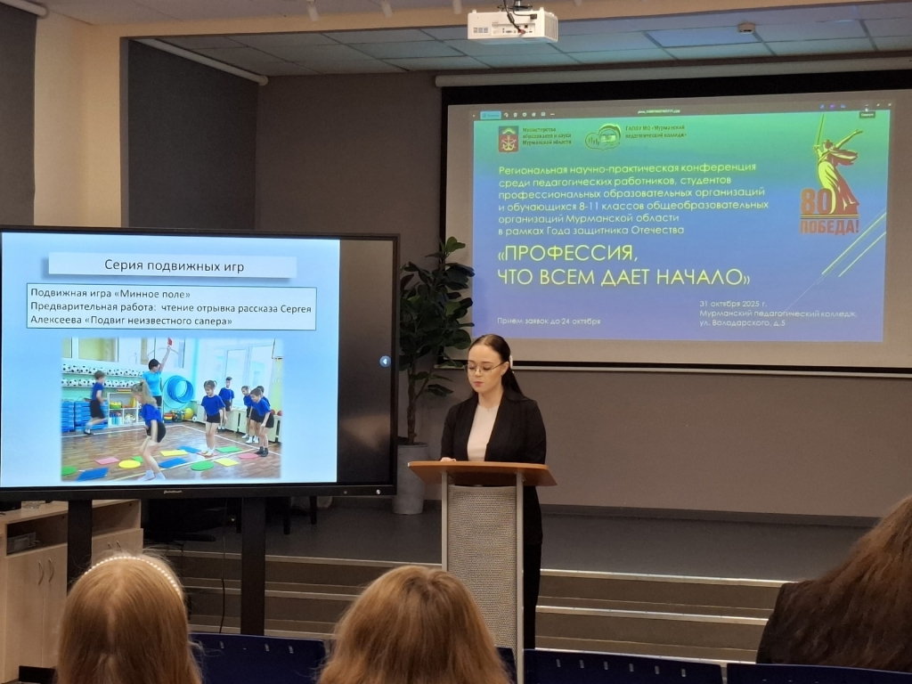 Региональная научно-практическая конференция «Профессия, что всем дает начало», которая состоялась 31 октября 2025 года на базе Мурманского педагогического колледжа, была посвящена Году защитника Отчества. Студенты Гавричкина Арина (12 группа), Шквир Степан (104 группа) представили колледж в секции «Историческая память России» с докладом «Математика как орудие Победы» под руководством преподавателя математики Казакова Павла Анатольевича.